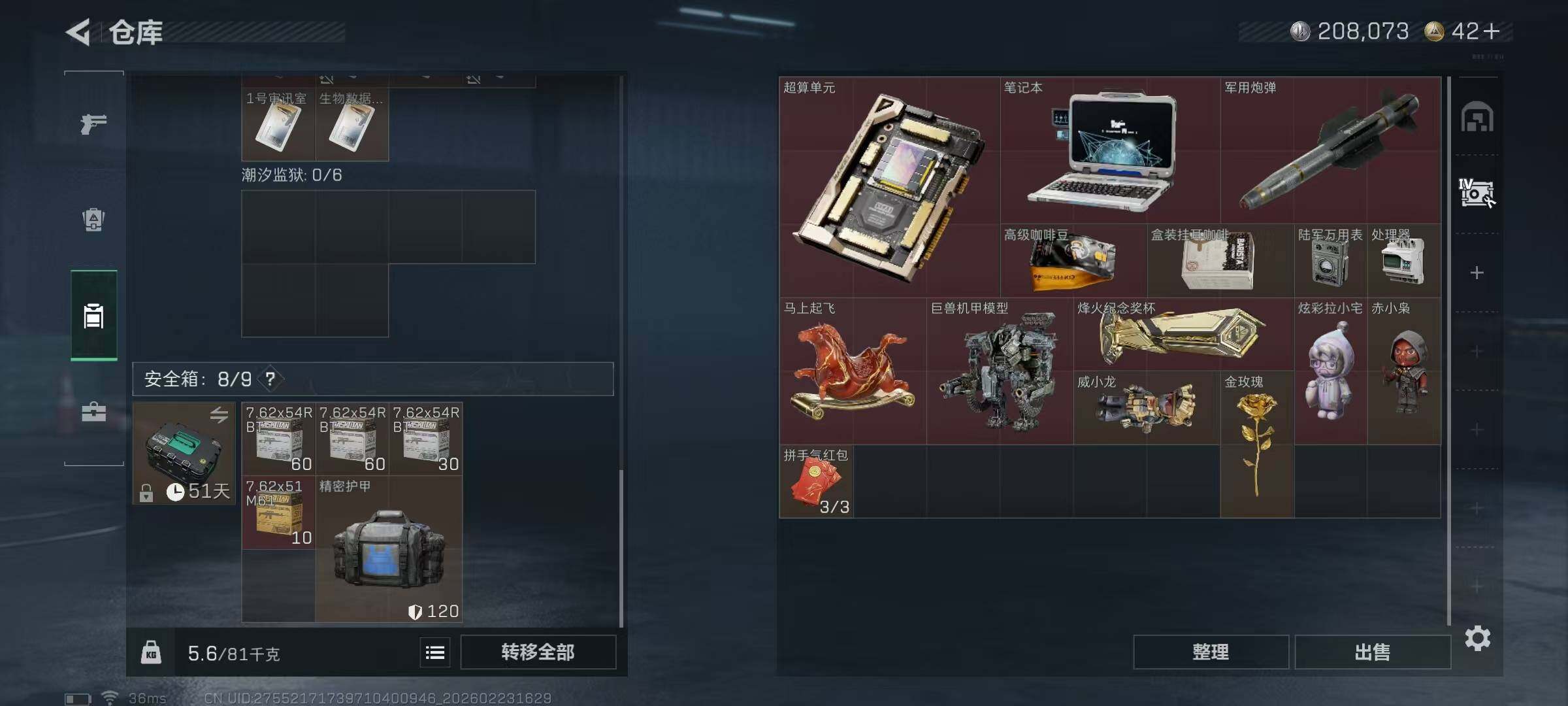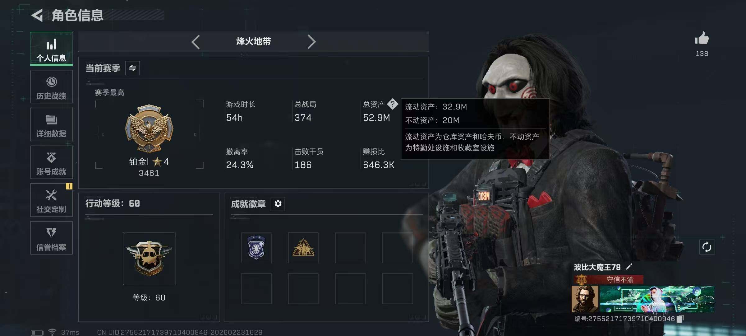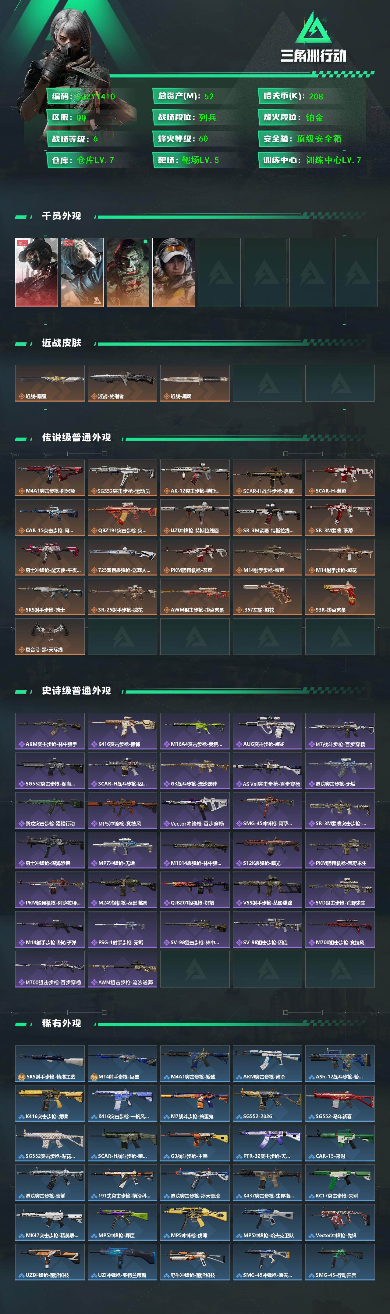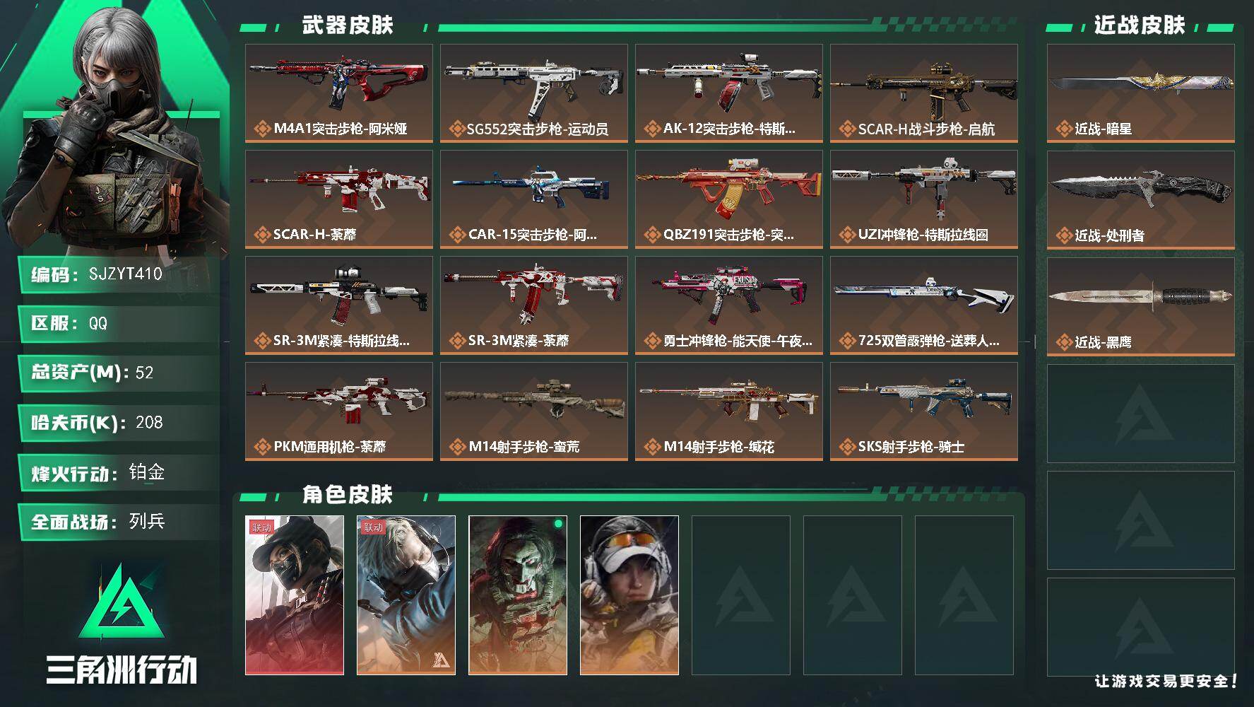 【SJZYT410】总资产(M):52M/哈夫币(K):208K/哈夫币(K):208K/传说枪皮数:21/全面战场等级:6_段位:列兵/烽火地带等级:60_段位:铂金/露娜-黑·天际线/送葬人·无题密令/红狼-电锯惊魂/露娜-金牌射手/近战-暗星/近战-处刑者/黑鹰/M4A1突击步枪-阿米娅/SG552突击步枪-运动员/AK-12突击步枪-特斯拉线圈/SCAR-H战斗步枪-启航/SCAR-H战斗步枪-荼蘼/CAR-15突击步枪-阿米娅/腾龙突击步枪-捞点薯条/UZI冲锋枪-特斯拉线圈/SR-3M紧凑突击步枪-特斯拉线圈/SR-3M紧凑突击步枪-荼蘼/勇士冲锋枪-能天使-午夜邮差/725双管霰弹枪-送葬人-无题密令/PKM通用机枪-荼蘼/M14射手步枪-蛮荒/M14射手步枪-缄花/SKS射手步枪-骑士/SR-25射手步枪-缄花/AWM狙击步枪-捞点薯条/.357左轮-缄花/93R-捞点薯条/复合弓·黑-天际线/AKM突击步枪林中猎手/K416突击步枪-腊梅/M16A4突击步枪-竞赛选手/AUG突击步枪-蝮蛇/M7战斗步枪-百步穿杨/SG552突击步枪深海恐惧/SCAR-H战斗步枪-囚徒/G3战斗步枪-流沙送葬/AS Val突击步枪-百步穿杨/腾龙突击步枪-无垢/腾龙突击步枪-猎鳄行动/MP5冲锋枪-竞技风/Vector冲锋枪-百步穿杨/SMG-45冲锋枪-阿萨拉特攻/SR-3M紧凑突击步枪-荒野求生/勇士冲锋枪深海恐惧/MP7冲锋枪-无垢/M1014霰弹枪-林中猎手/S12K霰弹枪-曙光/PKM通用机枪-荒野求生/PKM通用机枪-阿萨拉特攻/M249轻机枪-丛影谍踪/QJB201轻机枪-炽焰/VSS射手步枪-丛影谍踪/SVD狙击步枪-荒野求生/M14射手步枪-甜心子弹/PSG-1射手步枪-无垢/SV-98狙击步枪-林中猎手/SV-98狙击步枪-囚徒/M700狙击步枪-竞技风/M700狙击步枪-百步穿杨/AWM狙击步枪-流沙送葬/SKS射手步枪-精湛工艺/M14射手步枪-巨兽/M4A1突击步枪-繁盛/AKM突击步枪-肃杀/ASh-12战斗步枪-繁盛/K416突击步枪-虎啸/K416突击步枪-一帆风顺/M7战斗步枪-捣蛋鬼/SG552突击步枪-2026/SG552突击步枪-马年新春/SG552突击步枪-贴花艺术/SCAR-H战斗步枪-荣耀列队/G3战斗步枪-主宰/PTR-32突击步枪-天网/CAR-15突击步枪-来财/腾龙突击步枪-雪崩/腾龙突击步枪-前沿科技/腾龙突击步枪-冰天雪地/K437突击步枪-生存指令/KC17突击步枪-来财/47突击步枪-精英联盟/MP5冲锋枪-弄臣/MP5冲锋枪-虎啸/MP5冲锋枪-哈夫克卫队/Vector冲锋枪-先锋/UZI冲锋枪-前沿科技/UZI冲锋枪-亚特兰蒂斯/野牛冲锋枪-前沿科技/SMG-45冲锋枪-哈夫克卫队/SMG-45-行动开启/SMG-45冲锋枪-幻影结构/SMG-45冲锋枪-天网/SR-3M紧凑突击步枪-雪崩/SR-3M紧凑突击步枪-马年新春/勇士冲锋枪-主宰/勇士冲锋枪-冰天雪地/M1014霰弹枪-幻影结构/M249轻机枪-冰天雪地/M250通用机枪-虎啸/M250通用机枪-天网/QJB201轻机枪-哈夫克卫队/Mini-14射手步枪-荣耀列队/SKS射手步枪-弄臣/SKS射手步枪-雪崩/SR-25射手步枪-开拓/SR-9射手步枪-街头涂鸦/PSG-1射手步枪-主宰/G18-星链科技/G18-哈夫克航天/K416突击步枪-纯白涂装/M700狙击步枪-纯白涂装/MP5冲锋枪-监察/S12K霰弹枪-监察/K437突击步枪-凶兽/SKS射手步枪-凶兽/M7战斗步枪-噬菌体/K437突击步枪-斑马/SKS射手步枪-彩墨涂鸦/M4A1突击步枪-粉色涂装/M4A1突击步枪-高雅黑/M4A1突击步枪-海色/AKM突击步枪-彩墨喷涂/QBZ95-1突击步枪-高雅黑/QBZ95-1突击步枪-海浪/QBZ95-1突击步枪-海色/QBZ95-1突击步枪-2026/K416突击步枪-几何迷彩/K416突击步枪-高雅黑/K416突击步枪-重击/M16A4突击步枪-三角洲力量/M16A4突击步枪-山林猎人/M16A4突击步枪-高雅黑/AUG突击步枪-浅蓝涂装/M7战斗步枪-红色涂装/M7战斗步枪-重击/SG552突击步枪-浅蓝涂装/SG552突击步枪-海浪/SG552突击步枪-彩墨喷涂/AK-12突击步枪-变色龙/SCAR-H战斗步枪-红色涂装/SCAR-H战斗步枪-数码迷彩/G3战斗步枪-高雅黑/G3战斗步枪-山林猎人/PTR-32突击步枪-黄蜂/PTR-32突击步枪-典雅/CAR-15突击步枪-变色龙/腾龙突击步枪-彩墨喷涂/K437突击步枪-磐石/AKS-74U突击步枪-磐石/MP5冲锋枪-安全工作/MP5冲锋枪-海色/MP5冲锋枪-黄蜂/MP5冲锋枪-典雅/P90冲锋枪-三角洲力量/P90冲锋枪-安全工作/Vector冲锋枪-几何迷彩/UZI冲锋枪-海色/UZI冲锋枪-山林猎人/野牛冲锋枪-彩墨喷涂/野牛冲锋枪-高雅黑/SR-3M紧凑突击步枪-变色龙/QCQ171冲锋枪-三角洲力量/M1014霰弹枪-高雅黑/M1014霰弹枪-海浪/M1014霰弹枪-变色龙/M1014霰弹枪-重击/PKM通用机枪-彩墨喷涂/M249轻机枪-黄蜂/QJB201轻机枪-三角洲力量/QJB201轻机枪-山林猎人/QJB201轻机枪-磐石/QJB201轻机枪-典雅/Mini-14射手步枪-山林猎人/SVD狙击步枪-高雅黑/SVD狙击步枪-重击/SR-25射手步枪-黄蜂/SR9射手步枪-磐石/SV-98狙击步枪-红色涂装/SV-98狙击步枪-典雅/R93狙击步枪-变色龙/M700狙击步枪-山林猎人/沙漠之鹰-海浪/沙漠之鹰-高雅黑/沙漠之鹰-重击/93R-典雅/G17-2026/M1911-坚固材料/轮式突击炮-荣耀/挂饰-黑夜猎手/挂饰-幸运鼠鼠/挂饰-阿萨拉喷火兵/挂饰-窃风密探/挂饰-黄金视野/挂饰-黑/挂饰-崩岩重炮/挂饰-福禄/挂饰-聚宝盆/挂饰-特斯拉线圈/挂饰-来点薯条/挂饰-晶石幻想/挂饰-彩蛋/挂饰-启程/挂饰-雪人/挂饰-阿米娅/挂饰-仪典匕首/挂饰-牛角/挂饰-卡皮巴拉/挂饰-起舞的女郎/挂饰-紧急撤离/挂饰-麻将