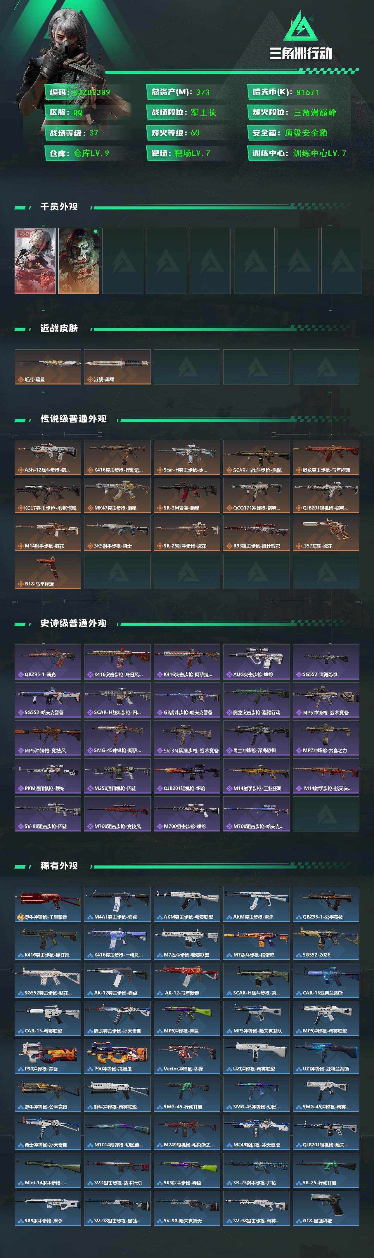 【SJZD2389】总资产(M):373M/哈夫币(K):81671K/哈夫币(K):81671K/传说枪皮数:16/全面战场等级:37_段位:军士长/烽火地带等级:60_段位:三角洲巅峰/骇爪-维什戴尔/红狼-电锯惊魂/近战-暗星/黑鹰/ASh-12战斗步枪-鹅鸭杀/K416突击步枪-行动记录/SCAR-H战斗步枪-水墨云图/SCAR-H战斗步枪-启航/腾龙突击步枪-马年祥瑞/KC17突击步枪-电锯惊魂/47突击步枪-暗星/SR-3M紧凑突击步枪-暗星/QCQ171冲锋枪-鹅鸭杀/QJB201轻机枪-鹅鸭杀/M14射手步枪-缄花/SKS射手步枪-骑士/SR-25射手步枪-缄花/R93狙击步枪-维什戴尔/.357左轮-缄花/G18-马年祥瑞/QBZ95-1突击步枪-曙光/K416突击步枪-冬日风情/K416突击步枪-阿萨拉特攻/AUG突击步枪-蝮蛇/SG552突击步枪深海恐惧/SG552突击步枪-哈夫克警备/SCAR-H战斗步枪-囚徒/G3战斗步枪-哈夫克警备/腾龙突击步枪-猎鳄行动/MP5冲锋枪-战术竞备/MP5冲锋枪-竞技风/SMG-45冲锋枪-阿萨拉特攻/SR-3M紧凑突击步枪-战术竞备/勇士冲锋枪深海恐惧/MP7冲锋枪-六套之力/PKM通用机枪-蝮蛇/M250通用机枪-囚徒/QJB201轻机枪-炽焰/M14射手步枪-工业狂潮/ M14射手步枪-航天庆典/SV-98狙击步枪-囚徒/M700狙击步枪-竞技风/M700狙击步枪-蝮蛇/M700狙击步枪-哈夫克警备/野牛冲锋枪-千里骏骨/M4A1突击步枪-零点/AKM突击步枪-精英联盟/AKM突击步枪-肃杀/QBZ95-1突击步枪-公平竞技/K416突击步枪-碳纤维/K416突击步枪-一帆风顺/M7战斗步枪-精英联盟/M7战斗步枪-捣蛋鬼/SG552突击步枪-2026/SG552突击步枪-贴花艺术/AK-12突击步枪-零点/ AK-12突击步枪-马年新春/SCAR-H战斗步枪-荣耀列队/CAR-15突击步枪-亚特兰蒂斯/CAR-15突击步枪-精英联盟/腾龙突击步枪-冰天雪地/MP5冲锋枪-弄臣/MP5冲锋枪-哈夫克卫队/MP5冲锋枪-精英联盟/P90冲锋枪-黄昏/P90冲锋枪-捣蛋鬼/Vector冲锋枪-先锋/UZI冲锋枪-精英联盟/UZI冲锋枪-亚特兰蒂斯/野牛冲锋枪-公平竞技/野牛冲锋枪-精英联盟/SMG-45-行动开启/SMG-45冲锋枪-幻影结构/SMG-45冲锋枪-精英联盟/勇士冲锋枪-冰天雪地/M1014霰弹枪-幻影结构/M249轻机枪-毛鲁斯之力/M249轻机枪-冰天雪地/QJB201轻机枪-哈夫克卫队/Mini-14射手步枪-荣耀列队/SVD狙击步枪-战术行动/SKS射手步枪-弄臣/SR-25射手步枪-开拓/SR-25-行动开启/SR9射手步枪-肃杀/SV-98狙击步枪-星链科技/SV-98狙击步枪-哈夫克航天/SV-98狙击步枪-精英联盟/G18-星链科技/G18-哈夫克航天/G18-精英联盟/MP5冲锋枪-蛇纹涂装/M249轻机枪-蝴蝶/MP5冲锋枪-古铜/M4A1突击步枪-粉色涂装/M4A1突击步枪-高雅黑/M4A1突击步枪-海色/QBZ95-1突击步枪-高雅黑/QBZ95-1突击步枪-海浪/QBZ95-1突击步枪-三角洲力量/QBZ95-1突击步枪-海色/QBZ95-1突击步枪-2026/QBZ191突击步枪-三角洲力量/K416突击步枪-几何迷彩/K416突击步枪-高雅黑/M16A4突击步枪-高雅黑/AUG突击步枪-浅蓝涂装/M7战斗步枪-红色涂装/SG552突击步枪-浅蓝涂装/SG552突击步枪-海浪/SCAR-H战斗步枪-红色涂装/SCAR-H战斗步枪-数码迷彩/G3战斗步枪-高雅黑/PTR-32突击步枪-黄蜂/MP5冲锋枪-三角洲力量/MP5冲锋枪-海色/MP5冲锋枪-黄蜂/Vector冲锋枪-几何迷彩/UZI冲锋枪-海色/野牛冲锋枪-高雅黑/M1014霰弹枪-高雅黑/M1014霰弹枪-海浪/M1014霰弹枪-重击/M249轻机枪-黄蜂/M250通用机枪-条纹/M250通用机枪-雪松/QJB201轻机枪-三角洲力量/QJB201轻机枪-典雅/SVD狙击步枪-高雅黑/SKS射手步枪-三角洲力量/SR-25射手步枪-黄蜂/PSG-1射手步枪-雪松/SV-98狙击步枪-红色涂装/QSZ92G-条纹/沙漠之鹰-海浪/沙漠之鹰-高雅黑/G17-2026/M1A4坦克-驯鹿/轮式突击炮-荣耀/挂饰-火箭玫瑰/挂饰-窃风密探/挂饰-财神到/挂饰-维什戴尔/挂饰-蚀金玫瑰/挂饰-暗星/挂饰-磁吸炸弹/挂饰-枪匠/挂饰-启程/挂饰-仪典匕首/挂饰-大白鹅/挂饰-雪松/挂饰-汤圆/挂饰-北非蛋/挂饰-饺子/挂饰-缄花/挂饰-马到成功/挂饰-麻将